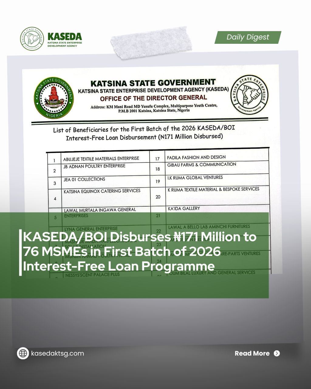 The Katsina State Enterprise Development Agency (KASEDA) is pleased to announce the disbursement of a total sum of ₦171 million to 76 Micro, Small, and Medium Enterprises (MSMEs) as the first batch of the 2026 KASEDA/BOI Interest-Free Loan Programme.